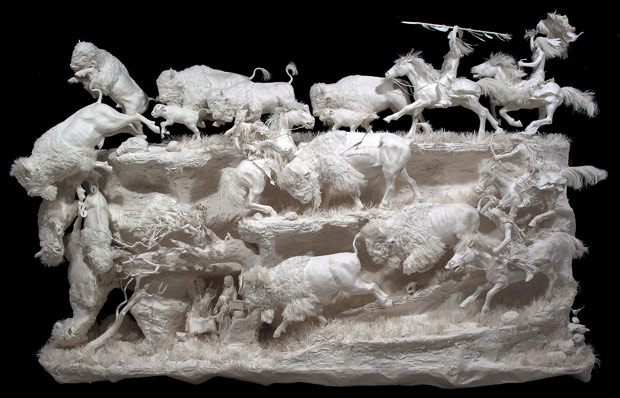 These stunningly detailed sculptures may only be made from paper but they are being snapped up by art fans for tens of thousands of dollars. The intricate creations depict Native American scenes and took up to 11 months to make using a specially formulated paper.