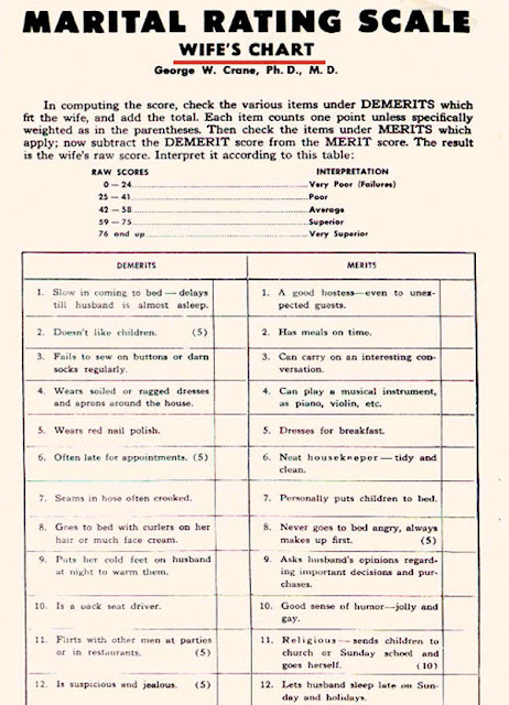 When we get glimpses of the way things used to be back before the divorce rate climbed to one in three, whether it’s a scene from Mad Men or the charts presented here, we try not to think that this might have been the way things were for our grandparents and great-grandparents — that marriage was a kind of pleasant business partnership in which both partners walked a fine line between cheerful (he) and deferential (she). Would my great-grandfather have really been disappointed if his wife “put her cold feet” on him at night “to warm them”? Then again, can I even imagine my great-grandmother putting her cold feet on him at night to warm them? Nope.