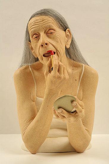 The characters in Tip Toland’s hyper realistic sculptures are fragile creatures that find themselves at the end of adulthood or at the beginning of childhood. Those stages in life have a certain vulnerability, isolation and innocence in common. Toland attempts to demonstrate the decline preceding death, and the increased separation from others it brings. Their expressions are unengaged and convey a sense of deep psychological detachment that is sad and enigmatic as well as dignified by the process of natural aging. In his article for, Ceramics: Art and Perception, Glen Brown states, “[The works] weigh upon [the viewer] for the simple reason that they reflect the profound, inevitable solitude that envelops the beginning and the end of life.”