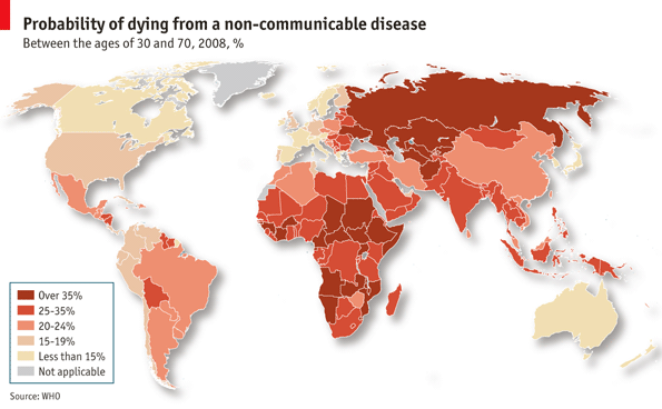YOU are more likely to be killed by a non-communicable disease (NCD), like cancer or heart disease, than anything else. In 2008 they accounted for 63% of the 56m deaths worldwide. Growing populations and increased longevity are making the problem worse. By 2030, 22% of people in the OECD club of rich countries will be 65 or older, nearly double the share in 1990. China will catch up just six years later. About half of American adults already have a chronic condition, such as diabetes or high blood pressure, and as the world becomes richer the diseases of the rich spread farther. In the slums of Calcutta, although infectious diseases claim the young; for middle-aged adults, heart disease and cancer are the most common killers.