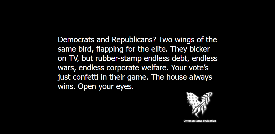 Democrats and Republicans Featured, Political, View Point Nov 122025 Democrats and Republicans? Two wings of the same bird, flapping for the elite. They bicker on TV, but rubber-stamp endless debt, endless wars, endless corporate welfare. Your vote’s just confetti in their game. The house always wins. Open your eyes. Sorry, the comment form is closed at this time.