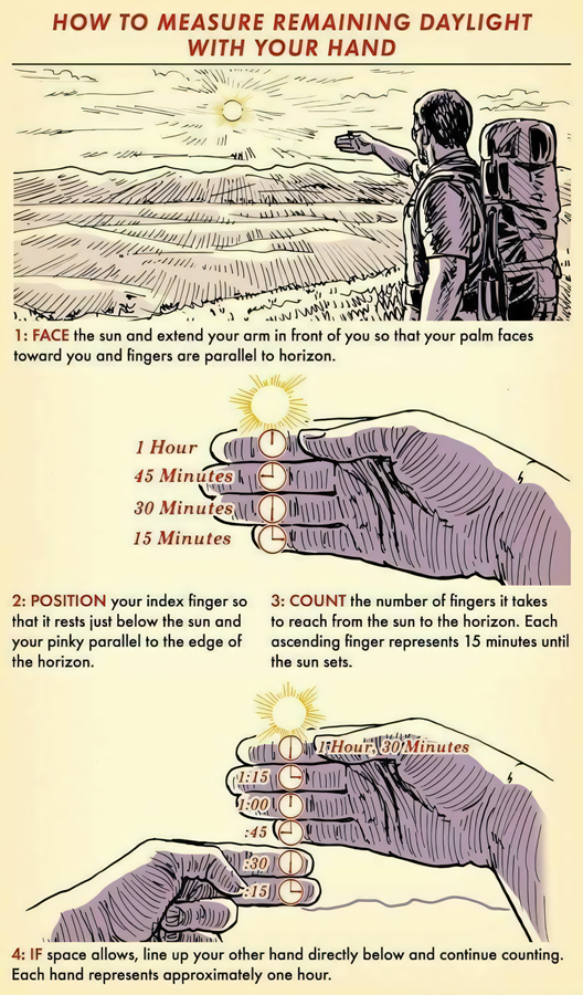 You can estimate the amount of remaining daylight by using your hand and the horizon. This is a popular outdoorsman trick known as the “hand method” or “finger rule.” Here’s how to do it: