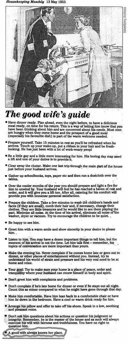 This advice have appeared in a 1955 issue of Housekeeping Monthly. Oh how times have changed.