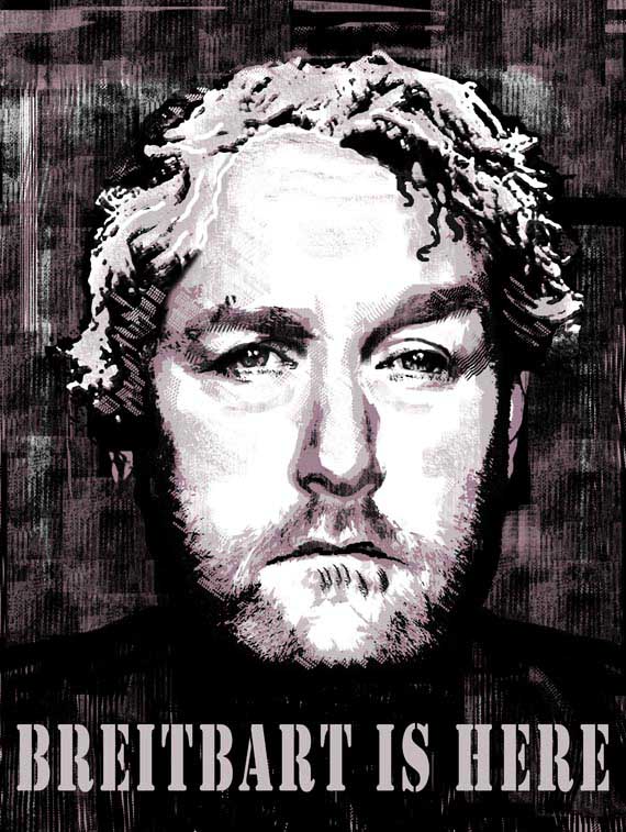 There is a new street art poster that’s being emailed around and will no doubt eventually be spotted on a street corner near you. It’s a gritty black and white image of Andrew Breitbart looking both battle-worn and ever vigilant with the caption: “BREITBART IS HERE.”