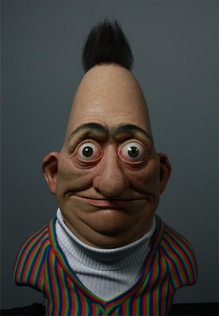 Bert, one-half of everyone’s favorite homosexual Muppet couple (sorry, crotchety old bickering guys!) is seen here in a little too life-like silicon sculpture by artist and Effects Studio member Nacho (you’re useless without cheese!). As you can see, he has a face that would send children running straight into traffic (and not zig-zagging like you’re supposed to). Damn, somebody’s gonna have nightmares tonight. And it’s gonna be you. Get it? Because I’m gonna call right before bed and be all creepy!