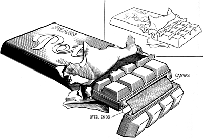 The chocolate bars were more akin to hand grenades than the confections they purported to be. They were steel-encased explosives covered with chocolate, all wrapped up in a candy bar-like wrapper. To detonate the bomb, the operative (or would-be victim) would break off the first row of “chocolate,” revealing a canvas strap. The strap worked like the pin in a hand grenade; once it was removed, there would be only a few seconds before the bomb would explode.
