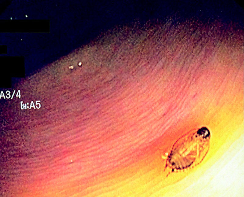 “A 52-year-old woman with a history of depression was referred by her primary physician for colorectal cancer screening. She had no family history of colorectal cancer and a review of systems was positive for abdominal bloating. Bowel preparation was done using 4 L of polyethylene glycol the evening prior to screening colonoscopy. The procedure was uncomplicated with no gross mucosal pathology, however, an insect was found in the transverse colon (Fig. 1, to the left), was found in the transverse colon on a routine screening colonoscopy.). The insect was aspirated and sent to the lab for further identification. The insect had three body segments (head, thorax, and abdomen) with ventrodorsal flattening of the body and a segmented abdomen, three pairs of legs extending from the thorax (with spikes and claw-like terminal appendages), elongated hind legs, and a pair of elongated antennae extending from the head to beyond the hind legs.These morphologic findings were most consistent with the nymph form of Blattella germanica (German cockroach) of the Blattellidae family, a common household pest. The patient had a cockroach infestation at home and hence it was hypothesized that she may have inadvertently ingested a cockroach with food.”
