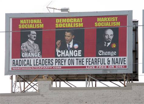 An Iowa tea party group’s billboard comparing President Obama to Adolf Hitler and Vladimir Lenin has been taken down.