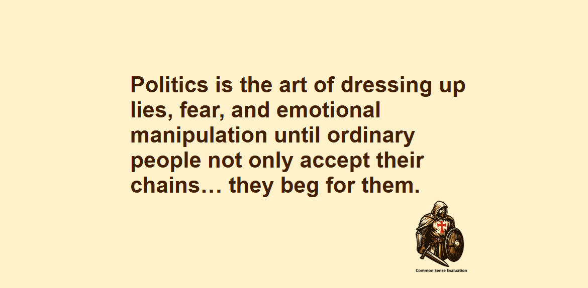 Chains Featured, Political, View Point No Responses » Mar 272026 Politics is the art of dressing up lies, fear, and emotional manipulation until ordinary people not only accept their chains… they beg for them.