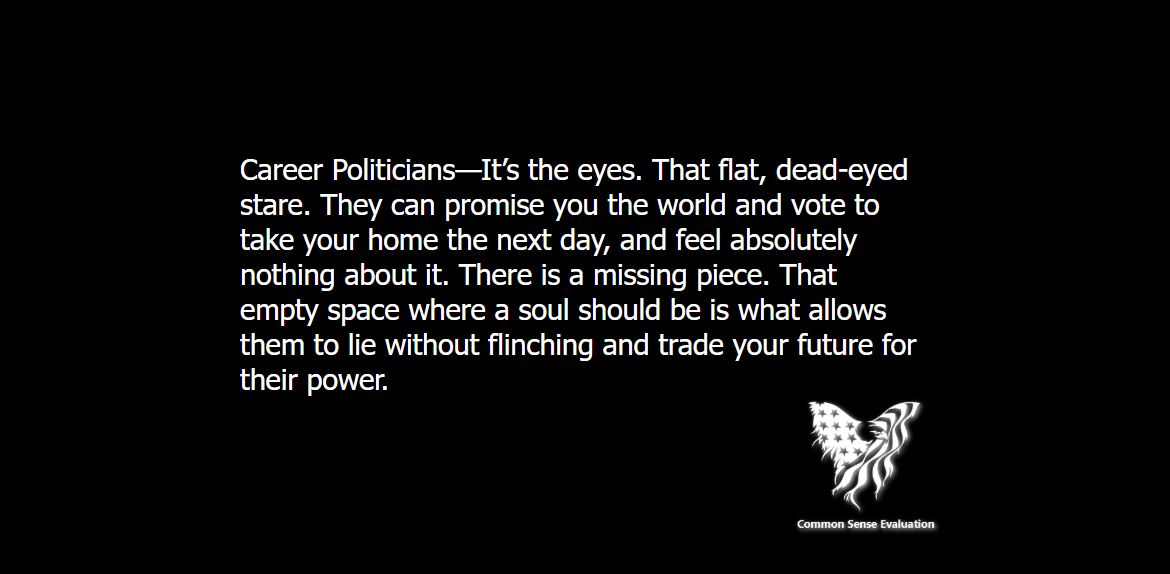 Career Politicians—It’s the eyes. That flat, dead-eyed stare. They can promise you the world and vote to take your home the next day, and feel absolutely nothing about it. There is a missing piece. That empty space where a soul should be is what allows them to lie without flinching and trade your future for their power.