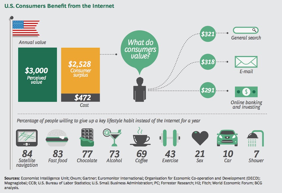 How important is the Internet to us, really? That’s what Boston Consulting Group asked in their recently released study, which weighed the Internet’s importance on everything from the global economy (which will account for 5.2% of GDP for G20 countries by 2016) to individual lives (polls found that 21% of Americans would give up sex for Internet access, but only 10% would give up their cars).